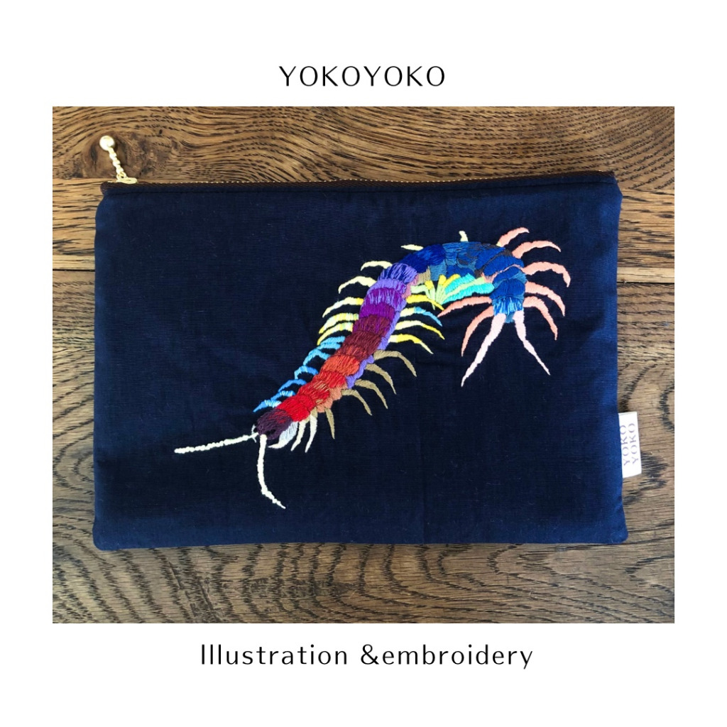 ムカデの刺繍はポーチに仕立てます。