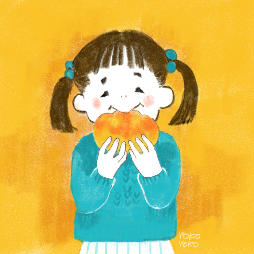 クリームパンをほおばる女の子のイラストを描かせていただきました。