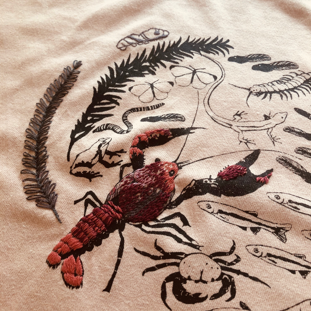 ザリガニは渋目の赤とピンク、グレーを合わせて刺繍しました。