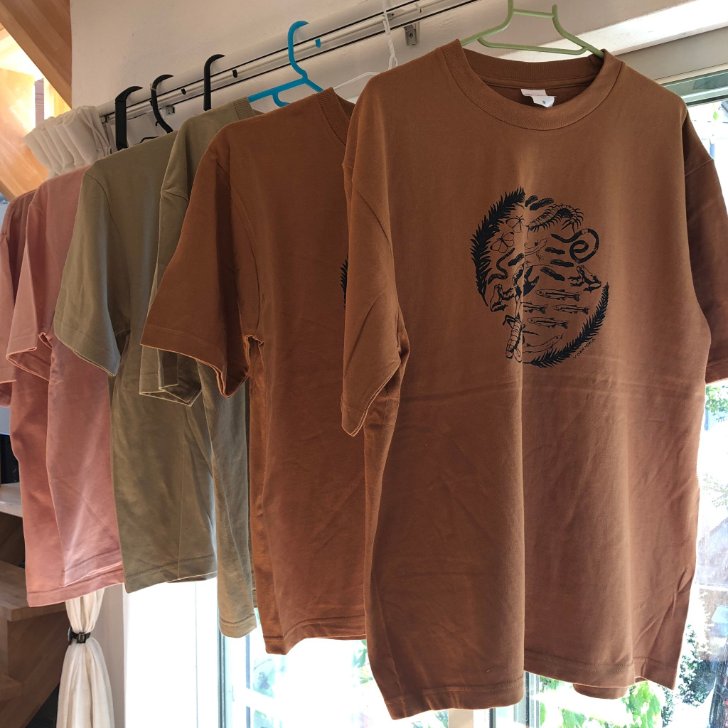 Tシャツはキャメル、くすみピンク、カーキ、ベージュなど、