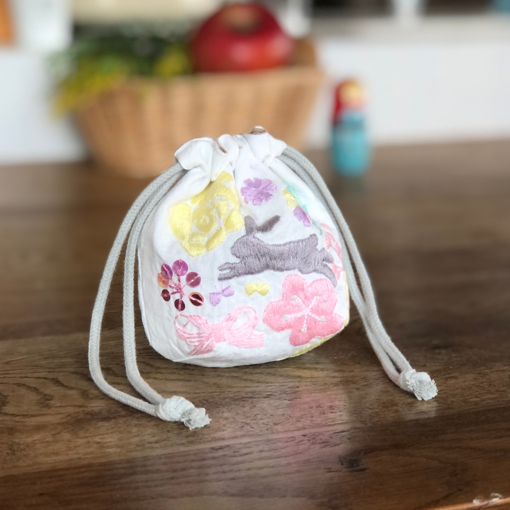 その時に制作した刺繍をポーチと巾着に仕立てて、