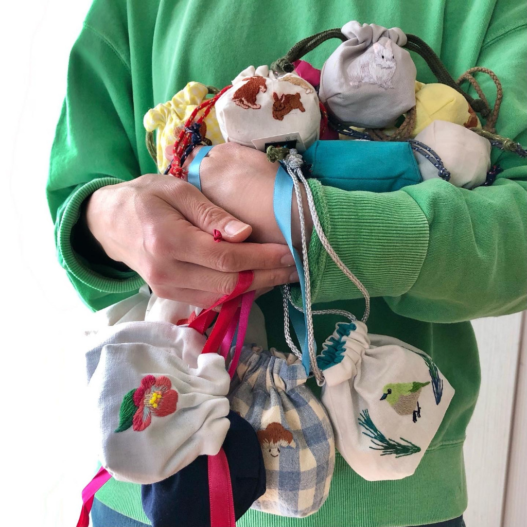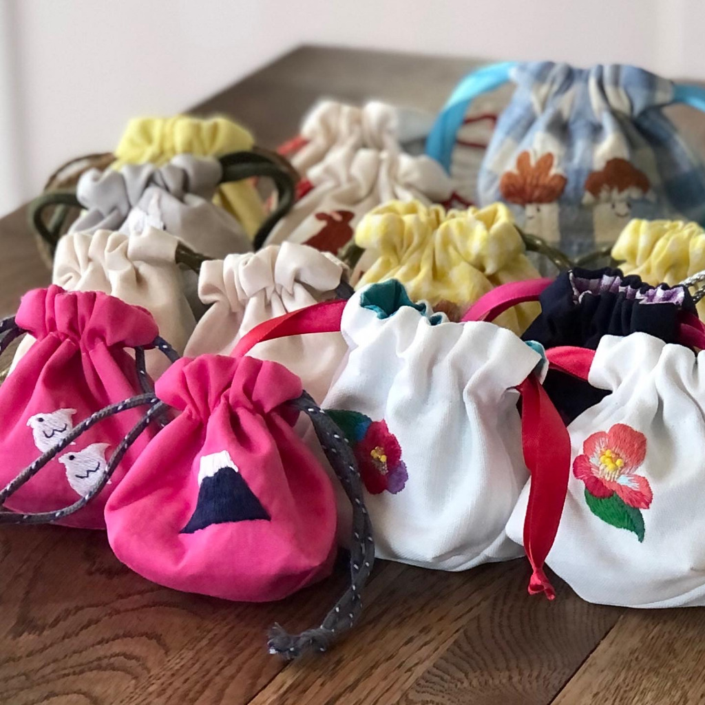 今回の展示は巾着袋を作ってみました。