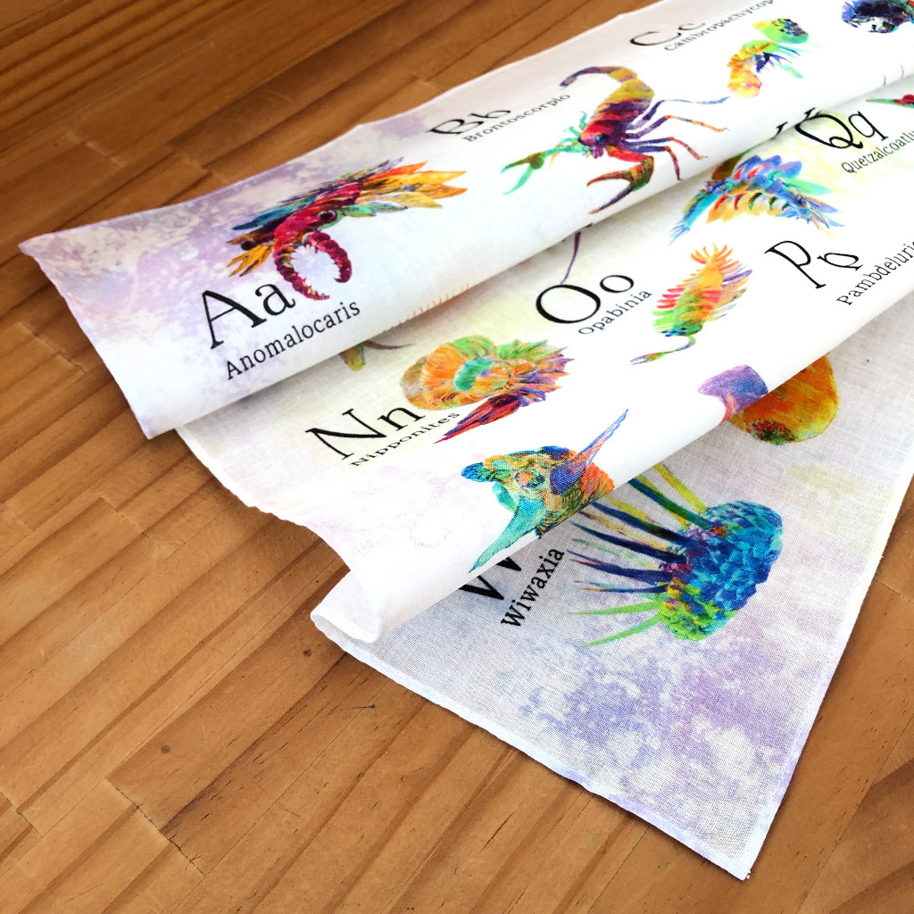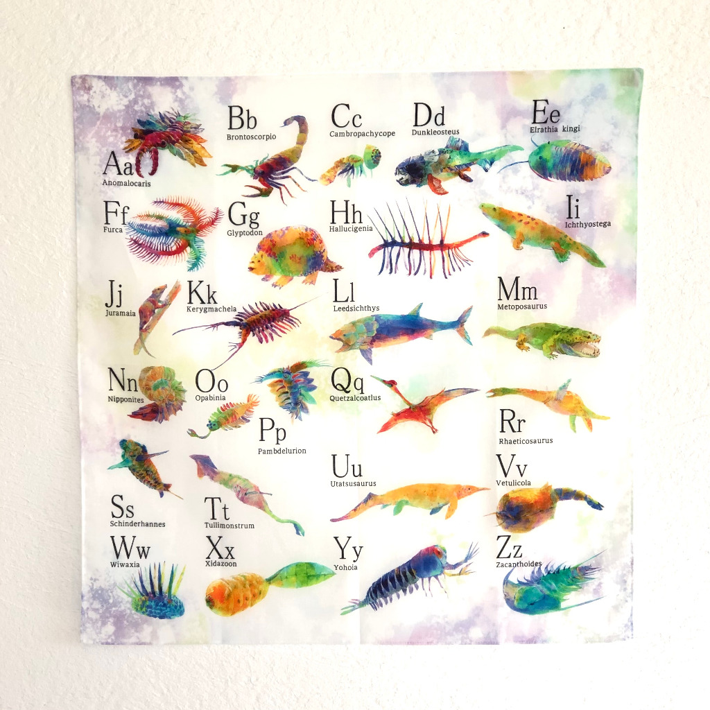 Zまでの古生物をアルファベット表にしたバンダナです。