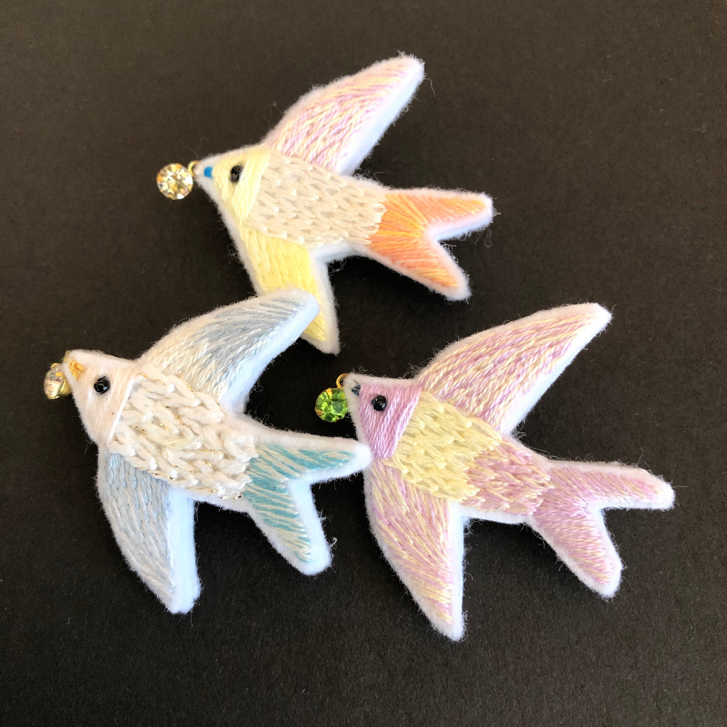 私は新作のツバメのブローチを始め、