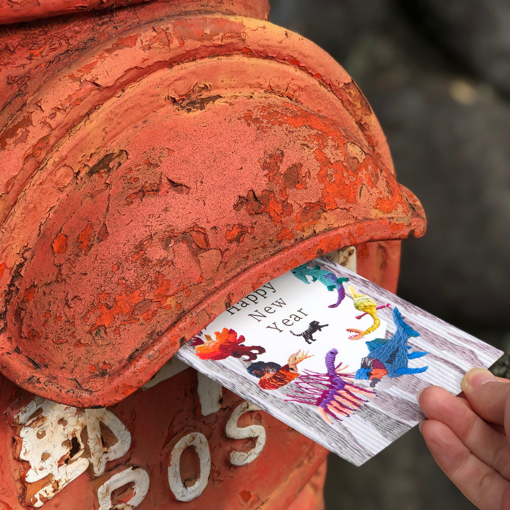 古生物刺繍の年賀状。