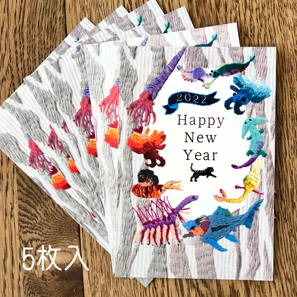 古生物手刺繍の年賀状と、